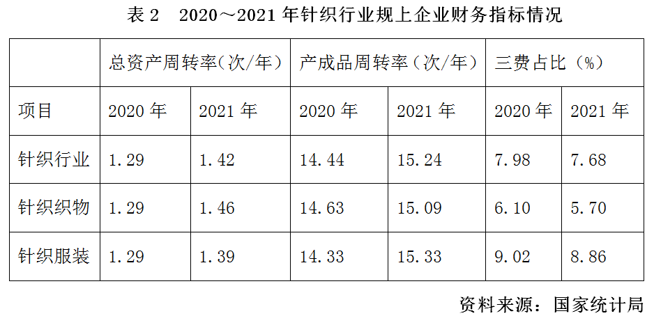 2021年針織服裝規(guī)模以上企業(yè)總資產(chǎn)周轉(zhuǎn)率和產(chǎn)成品周轉(zhuǎn)率分別為1.39次/年和15.33次/年,分別比2020年提高了7.75%和6.98%;三項(xiàng)費(fèi)用占比為8.86%,比2020年降低了0.16個(gè)百分點(diǎn)。
