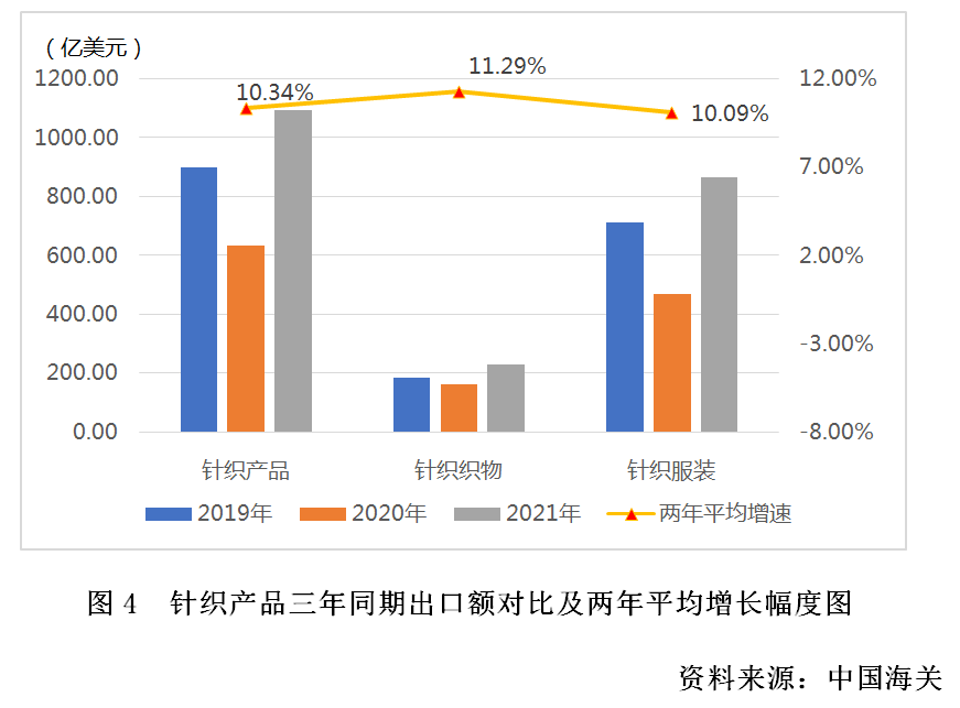 (三)出口強(qiáng)勢增長,出口額再破千億大關(guān)出口方面,在海外消費(fèi)需求反彈、部分訂單回流等因素支撐下,針織行業(yè)出口增長勢頭強(qiáng)勁。據(jù)中國海關(guān)數(shù)據(jù)統(tǒng)計(jì),2021年我國出口針織織物和針織服裝共計(jì)1095.82億美元,占全國紡織品服裝出口總額的34.73%,同比增長39.57%,較疫情前的2019年同期增長21.74%,兩年平均增長10.34%,為2015年以來最好水平。其中,針織織物累計(jì)出口額為231.10億美元,同比增長42.1%,比2019年同期增長23.86%,兩年平均增長11.29%;針織服裝累計(jì)出口864.72億美元,占全國服裝全年出口額的50.78%,同比增長39.0%,比2019年同期增長21.19%,兩年平均增長10.09%。(圖4)