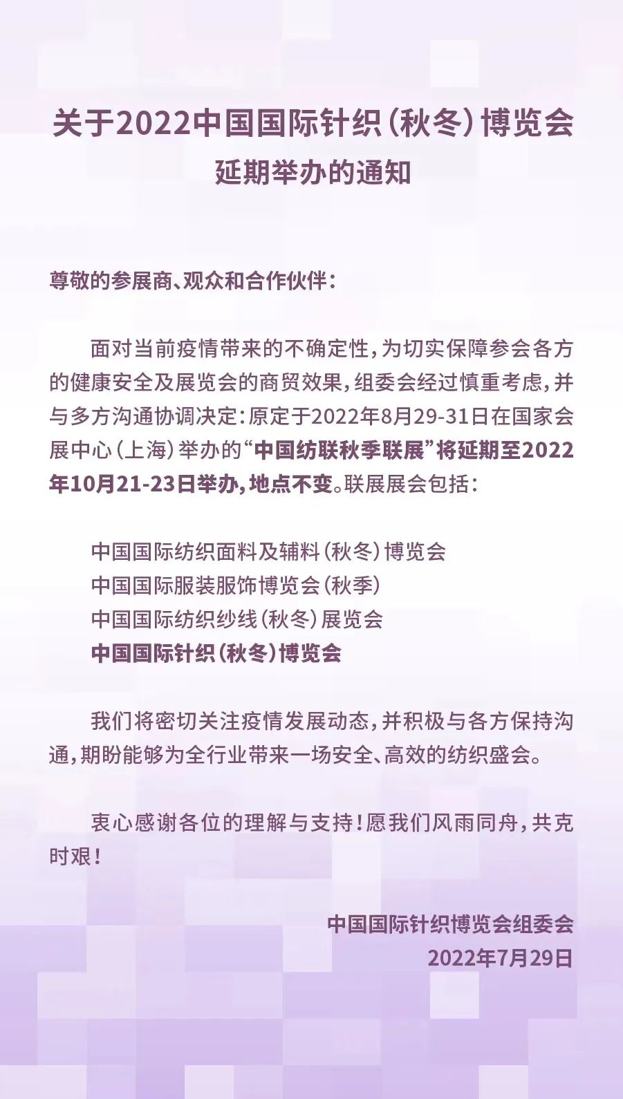關(guān)于2022中國國際針織(秋冬)博覽會(huì)延期舉辦的通知