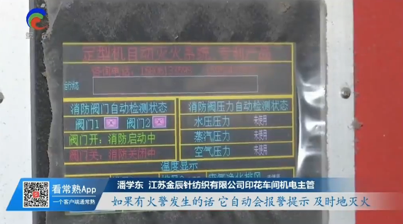 在生產現場,尤其是印染區(qū),先進的物聯網技術被應用于自動滅火系統,實現對整個生產區(qū)域的實時監(jiān)控。針對印染行業(yè)工序復雜、設備特殊、廢氣排放煙道火災隱患較大的特點,公司積極進行技術改造,為定型烘干設備及廢氣排煙道加裝了蒸汽滅火和水噴淋冷卻的自動消防滅火系統,公司印花車間機電主管潘學東表示,這套24小時監(jiān)測的系統能及時發(fā)現并處理火警情況,有效防止火災事故的發(fā)生。