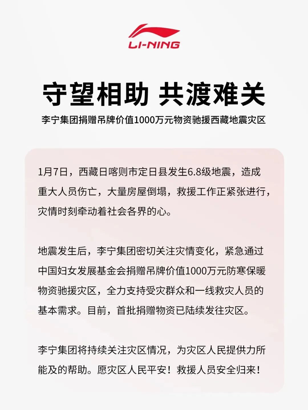 中國(guó)針織工業(yè)協(xié)會(huì)會(huì)員單位、李寧集團(tuán)密切關(guān)注災(zāi)情變化,集團(tuán)捐贈(zèng)吊牌價(jià)值1000萬(wàn)元的防寒保暖物資馳援西藏地震災(zāi)區(qū),并將持續(xù)關(guān)注災(zāi)區(qū)情況,為災(zāi)區(qū)人民提供力所能及的幫助。