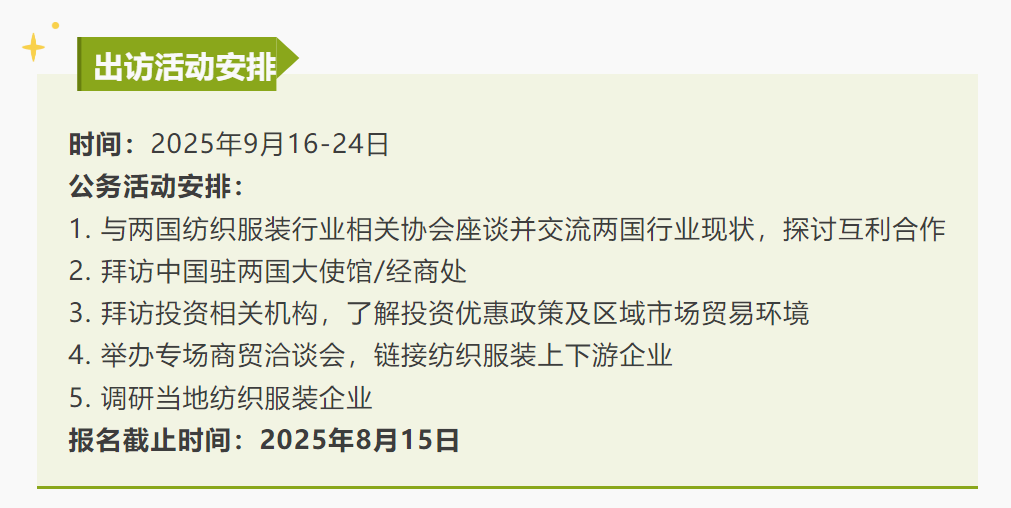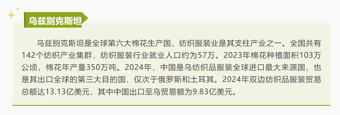 烏茲別克斯坦和吉爾吉斯斯坦作為中亞重要經(jīng)濟(jì)體,與中國(guó)在紡織服裝領(lǐng)域的合作尤為突出。為助力中國(guó)紡織服裝企業(yè)開拓中亞市場(chǎng),了解兩國(guó)投資潛力及貿(mào)易環(huán)境,中國(guó)國(guó)際貿(mào)易促進(jìn)委員會(huì)紡織行業(yè)分會(huì)將聯(lián)合中國(guó)針織工業(yè)協(xié)會(huì)共同組織中國(guó)紡織服裝優(yōu)秀企業(yè)家代表團(tuán)于2025年9月中下旬赴兩國(guó)開展行業(yè)調(diào)研與商貿(mào)對(duì)接活動(dòng),實(shí)地考察市場(chǎng)及投資潛力。