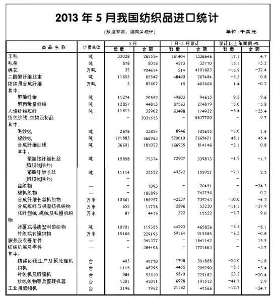 5月,紡織品和服裝進(jìn)口分別增長(zhǎng)8.5%和16.5%,其中大類商品紗線增長(zhǎng)34%,面料增長(zhǎng)0.6%,紡織制成品下降2.2%。1~5月,紡織品和服裝進(jìn)口分別增長(zhǎng)9.6%和15.3%,大宗商品中紗線增長(zhǎng)最快,進(jìn)口量增長(zhǎng)34.5%、進(jìn)口值增長(zhǎng)29.3%,其中占70%的棉紗線是拉動(dòng)增長(zhǎng)的主要產(chǎn)品,棉紗線量、值進(jìn)口分別達(dá)到48%和45%。紗線和針織、梭織服裝的進(jìn)口單價(jià)依然為負(fù)增長(zhǎng)。當(dāng)月紗線進(jìn)口單價(jià)下降2.1%,1~5月累計(jì)下降3.9%;針織、梭織服裝當(dāng)月下降7.8%,累計(jì)下降10.9%。