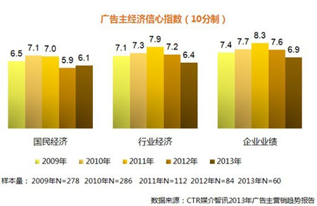 2012年的信心低迷在2013年仍在延續(xù)。廣告主雖然對國民經(jīng)濟的信心較平穩(wěn),但對行業(yè)和本企業(yè)的信心卻有明顯下滑。這一方面反映出廣告主對國家宏觀經(jīng)濟穩(wěn)定的看好。另一方面,說明廣告主對消費市場的不樂觀以及對市場競爭可能更加激烈的預測。