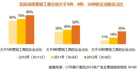 對比近三年廣告主的營銷工具實際使用情況,可以明顯的看到媒介使用的融合化狀態(tài),2012年使用10種以上營銷工具的廣告主比例較2011年幾乎翻倍,使用5種以上營銷工具的廣告主在調(diào)查中占到了8成。