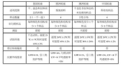 目前全球尚無統(tǒng)一的防紫外線紡織品檢測標準,各國制定的各種標準均采用儀器測試法來測定產(chǎn)品防紫外線性能,UPF值和一定波段的紫外線透射率是鑒別紡織品防紫外線性能的基本參數(shù)。在紫外線性能測試方法上各國標準基本相同,但在試樣準備和分級標簽方面卻有較大差異。