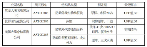 表一:各國抗紫外線測試方法標準間的差異表二:國際買家采購要求