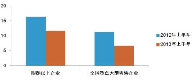 2013年上半年,國(guó)家統(tǒng)計(jì)局統(tǒng)計(jì)的限額以上企業(yè)服裝類商品零售額同比增長(zhǎng)11.7%,增速較2012年同期的16.4%低了4.7個(gè)百分點(diǎn)。
