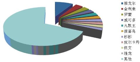 2013年6月份全國(guó)重點(diǎn)大型零售企業(yè)男西裝銷售前十位品牌市場(chǎng)份額合計(jì)為31.5%,其中雅戈?duì)柪^續(xù)占據(jù)榜首位置,金利來和羅蒙分列第二和第三位。