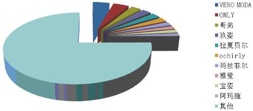 2013年6月份全國(guó)重點(diǎn)大型零售企業(yè)女裝銷售前十位品牌市場(chǎng)份額合計(jì)為24.9%,VERO MODA、ONLY和哥弟占據(jù)前三位。