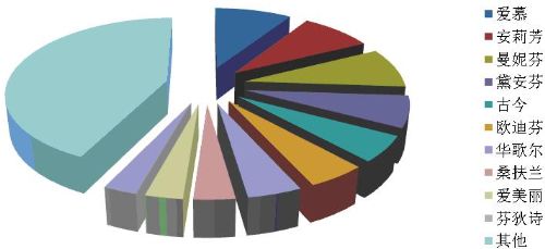 2013年6月份全國(guó)重點(diǎn)大型零售企業(yè)女性內(nèi)衣銷售前十位品牌市場(chǎng)份額合計(jì)為57.1%,愛慕、安莉芳和曼妮芬占據(jù)前三位。