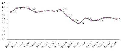 單價(jià)漲幅下降明顯 增速不及上年同期 上半年全國(guó)重點(diǎn)大型零售企業(yè)服裝銷(xiāo)售運(yùn)行情況 1.服裝銷(xiāo)售單價(jià)漲幅同比下降明顯 數(shù)據(jù)來(lái)源:國(guó)家統(tǒng)計(jì)局 根據(jù)國(guó)家統(tǒng)計(jì)局的數(shù)據(jù),2013年上半年國(guó)內(nèi)服裝商品居民消費(fèi)價(jià)格同比上漲2.5%,較上年同期低1.2個(gè)百分點(diǎn)。 ...