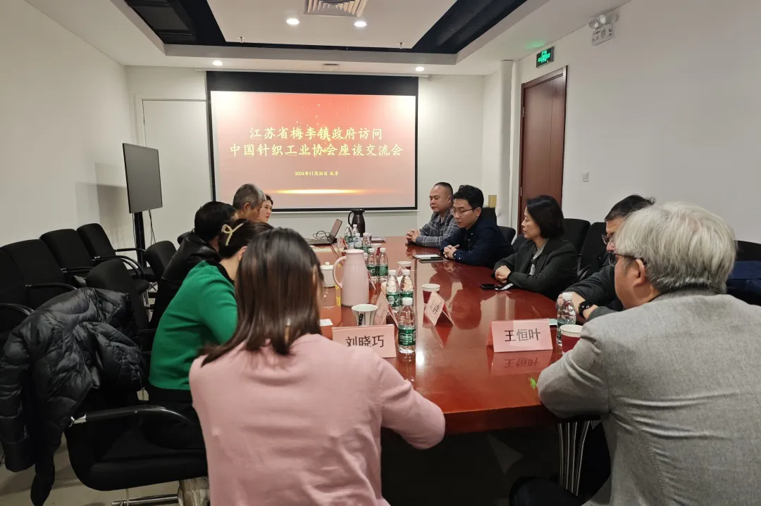 11月26日下午,江蘇省常熟市梅李鎮(zhèn)黨委委員周琴花,梅李鎮(zhèn)副鎮(zhèn)長王宸,梅李鎮(zhèn)經(jīng)濟發(fā)展辦公室主任陸偉宇,梅李鎮(zhèn)寨角村村委書記曹宇成,江蘇華達新材料科技有限公司總經(jīng)理王恒葉赴中國針織工業(yè)協(xié)會拜訪并進行座談。中國針織工業(yè)協(xié)會會長林云峰,副會長張希成...