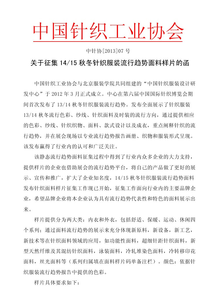 點(diǎn)擊下載:【征集1415秋冬針織服裝流行趨勢(shì)面料樣片的通知】