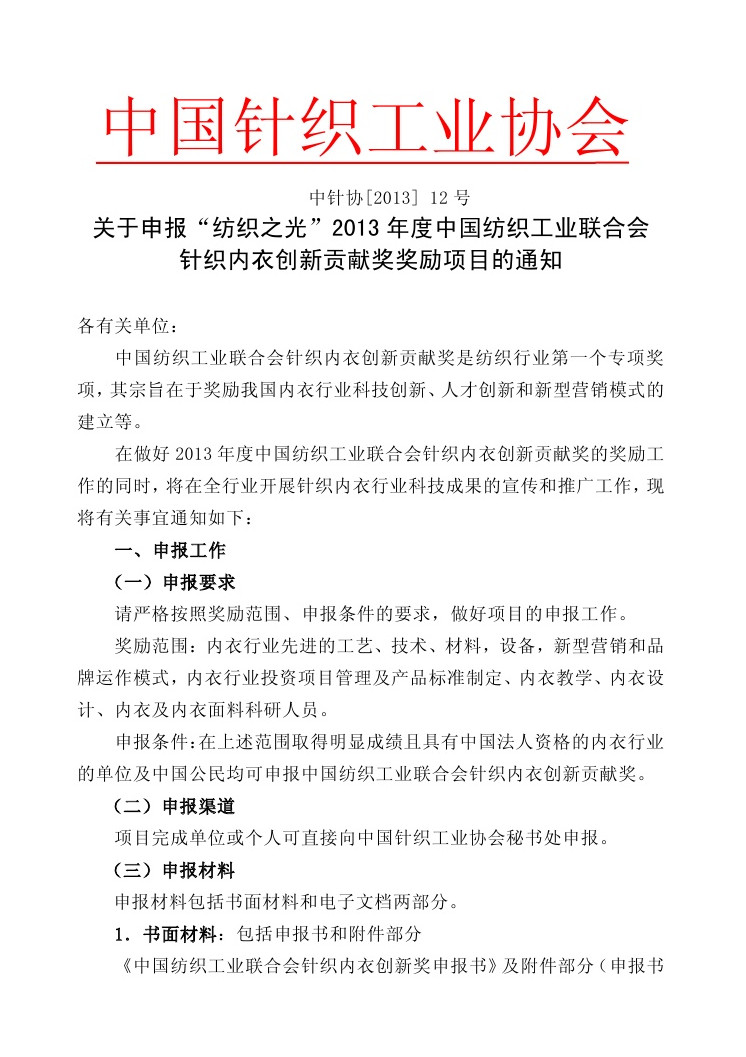點(diǎn)擊下載:【申報(bào)“紡織之光”2013年度中國(guó)紡織工業(yè)聯(lián)合會(huì)內(nèi)衣創(chuàng)新貢獻(xiàn)獎(jiǎng)勵(lì)項(xiàng)目的通知】
