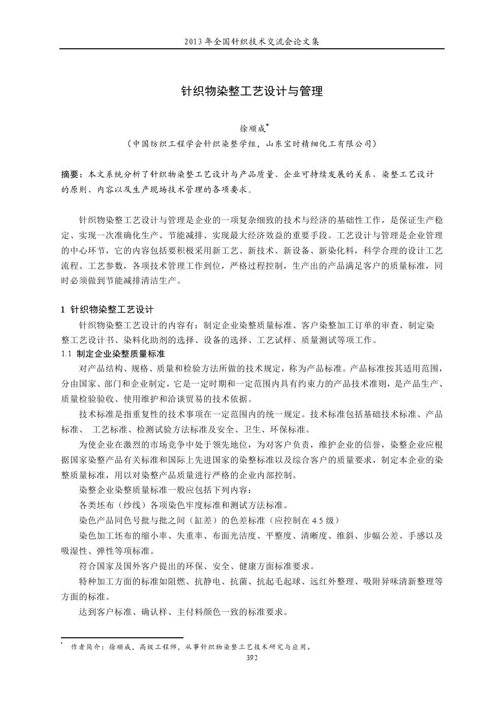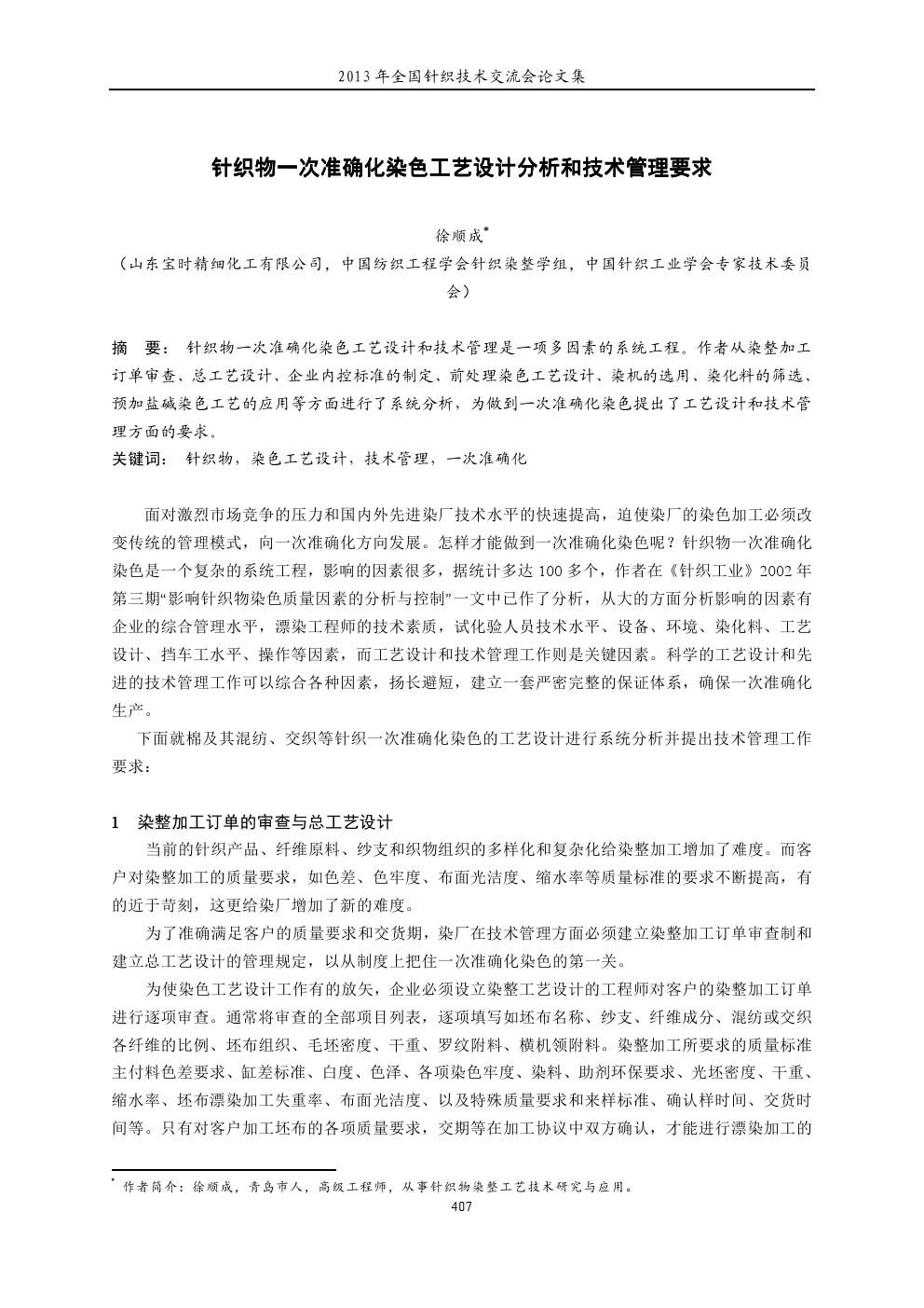 徐順成 (山東寶時精細化工有限公司,山東 青島 266000) 摘 要: 針織物一次準確化染色工藝設計和技術管理是一項多因素的系統(tǒng)工程。作者從染整加工訂單審查、總工藝設計、企業(yè)內控標準的制定、前處理染色工藝設計、染機的選用、染化料的篩選、預加鹽堿染...